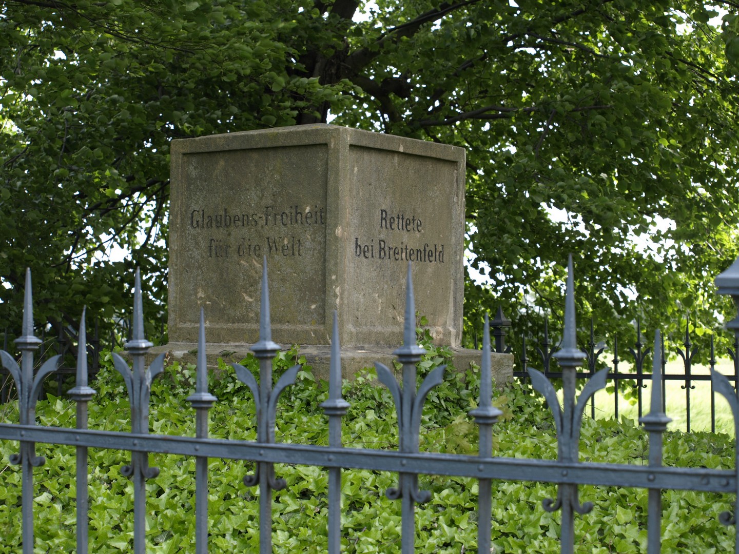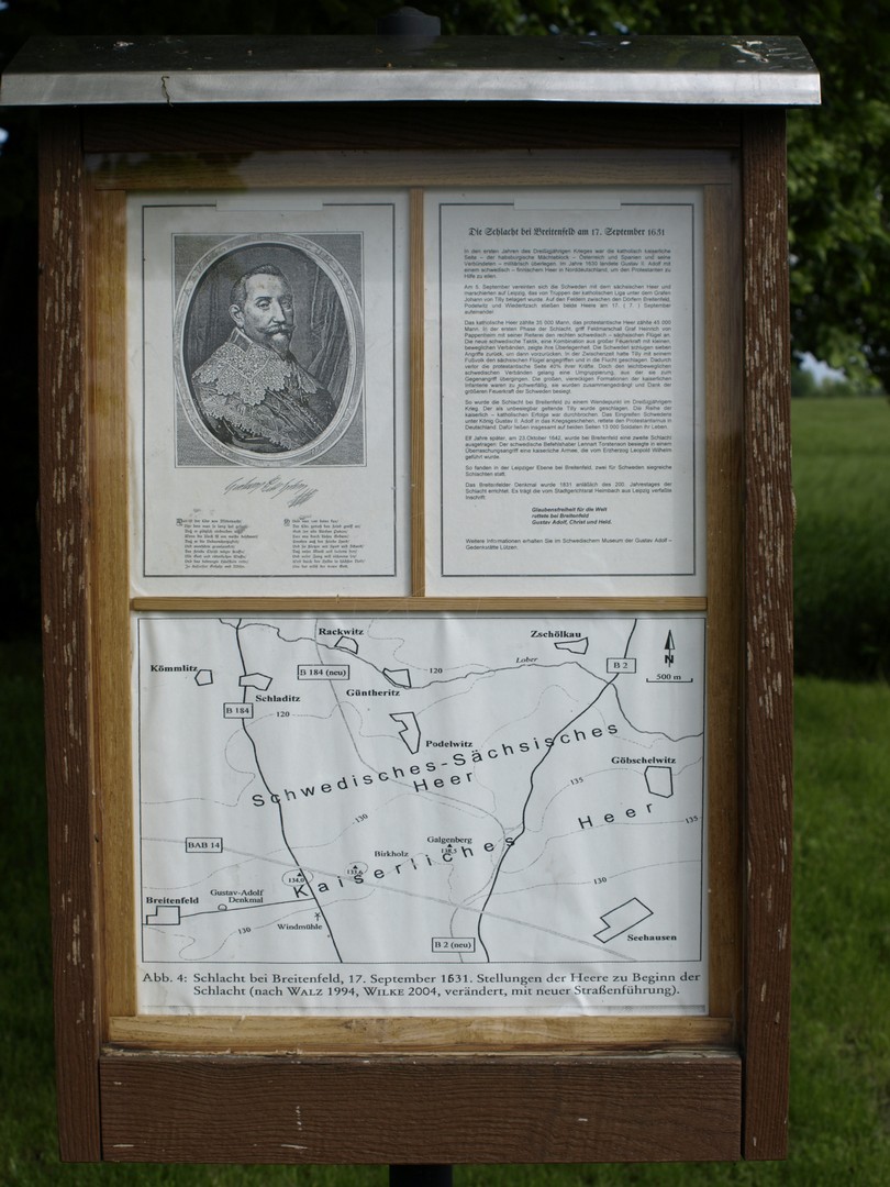 Leipzigin kaupunki kuuluu tärkeänä osana 30-vuotisen sodan tapahtumiin, koska sen läheisyydessä käytiin useita sodalle merkittäviä taisteluita. Ensimmäinen niistä käytiin Breitenbeldissä Leipzigin kaupungin pohjoispuolella ratsuväen käyttöä suosivalla, loivalla tasankomaalla 7. päivä syyskuuta 1631 Ruotsin kuningaskunnan ja Saksin — Pyhän saksalais-roomalaisen keisarikunnan keisarin Ferdinand II: n armeijoiden välillä. Ruotsin armeijan johdossa oli kuningas Kustaa II Adolf, sakseja johti vaaliruhtinas Yrjö I ja hänen liittolaisenaan katolisia kreivi Johan Tilly. Breitenfeld oli ensimmäinen suuri taistelu protestanttien ja katolisten välillä, joka päättyi Kustaa Adolfin armeijan murskavoittoon. Breitenfeldin taistelun tiimoilta ei löydy läheskään niin paljon materiaalia kuin monesta muusta 30-vuotisen sodan mittelöstä. Breitenfeldin muistopaikalle on jopa vaikea löytää, koska se on keskellä peltoa ja sinne ei johda kuin vaivainen kinttupolku. On myös vaikea löytää paikalle, koska ei ole mitään yleisölle tarjottavaa, ei edes kunnon parkkipaikkaa. Kuvani ovat Breitenfeldin muistomerkiltä. Taustalla näkyvät Leipzigin kaupungin siluetit ja on vaikea kuvitella, että näin aukealla paikalla ovat joskus kymmenet tuhannet sotilaat taistelleet verisesti. Taistelun verisessä loppunäytöksessä armoa ei pyydetty eikä armoa annettu.